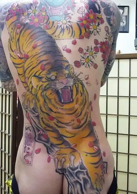Тигр – символ бесстрашия. Несмотря на то, что в Японии тигра можно встретить крайне редко, художники тату, начиная с конца периода Эдо, его изображают часто. В большей степени благодаря одному из героев романа «Суйкодэн», у которого на спине была татуировка в виде тигра.