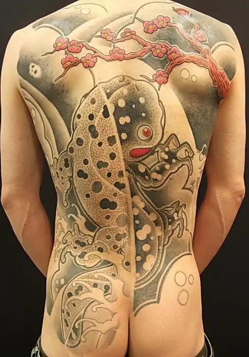 По этой причине в японской татуировке часто рядом с водными созданиями появляется мотив волны, служащий в качестве фона и выявления фактуры тела. Иногда он диктует стилистическое своеобразие.
