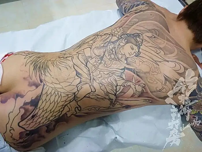 Наиболее бросающаяся в глаза черта японской татуировки – это ее обширность. Татуировка, которая последовательно на протяжении нескольких лет выполнялась человеку, могла привести к возникновению композиции в форме «кимоно» или «распахнутого плаща». Такая татуировка носит название полной и плотно покрывает торс, оставляя незаполненным пространство по центру груди и живота. В верхней части она достигает локтей, заполняя предплечья, в нижней заканчивается на бедрах.