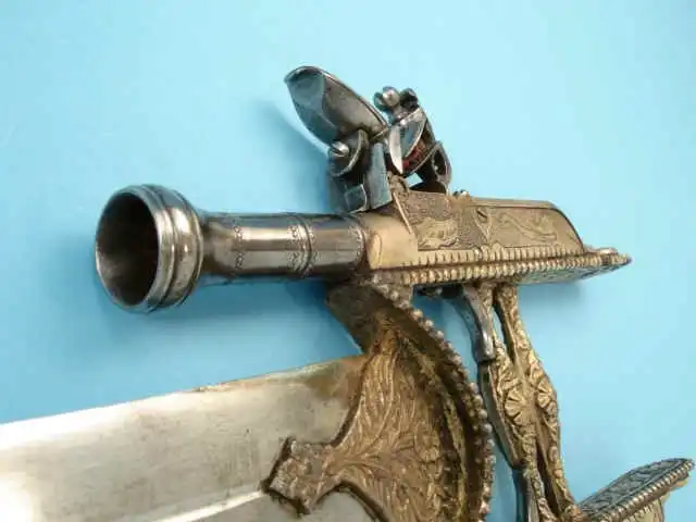 Поверхности рукояти и боковых пластин инкрустированы золотом и украшены сложным растительным и геометрическим орнаментом. Стреляющие устройства — кремневые пистолеты конструкции boxlock, полностью изготовленны из стали. На боковых поверхностях рамки имеется гравировка. Спусковые крючки в данном случае располагаются ближе к основанию клинка, чтобы не мешать удобному хвату рукояти.