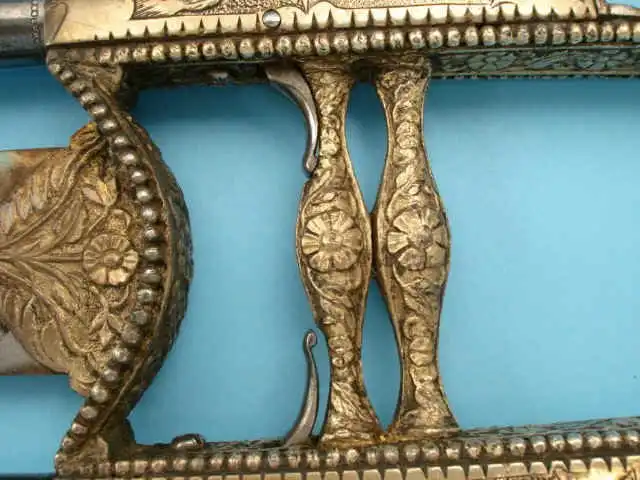 Кинжал катар с кремневыми пистолетами (Katar Flintlock Pistol), представленный на фото, имеет узкий клинок (обычно это свидетельствует о импортном происхождении клинка). Основание клинка крепится с помощью треугольного выступа передней части крестовины. Рукоять, боковые пластины имеют украшения в виде цветочного и растительного орнамента и по контуру отделаны шариками в виде бисера.