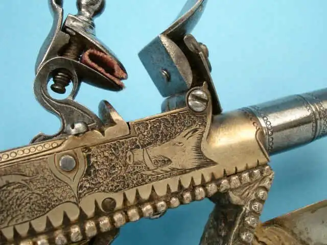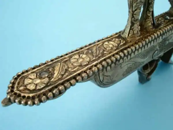 Кремневые пистолеты, на представленном кинжале катар, состоят и рамки с кремневым замком и стола. Рамка латунная, на ее боковых поверхностях имеется гравировка в виде головы слона и дикого кабана. Замки без предохранительных устройств.