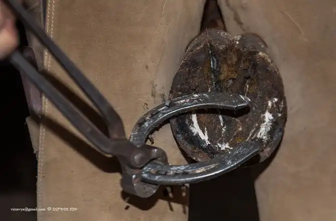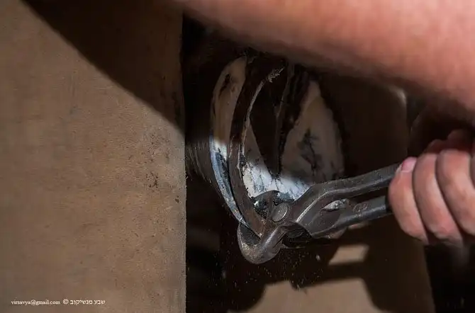 Кузнец снимает клещами старую подкову. Собственно, просто отрывает ее вместе с гвоздями.