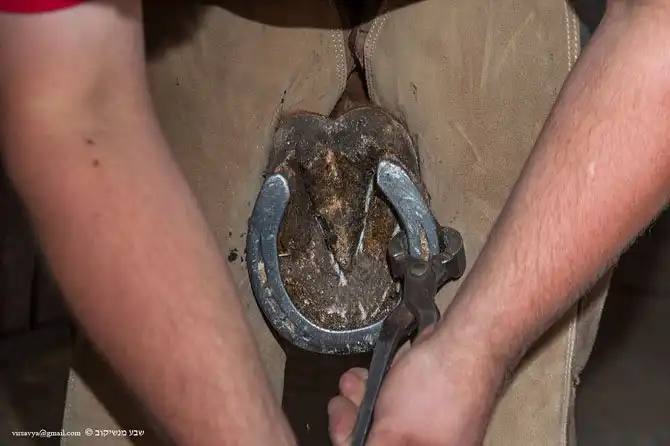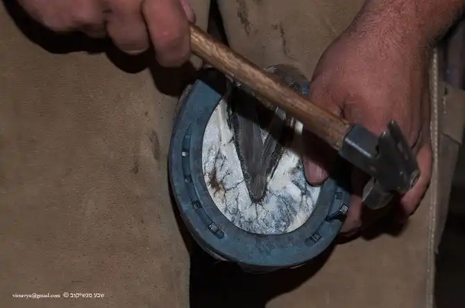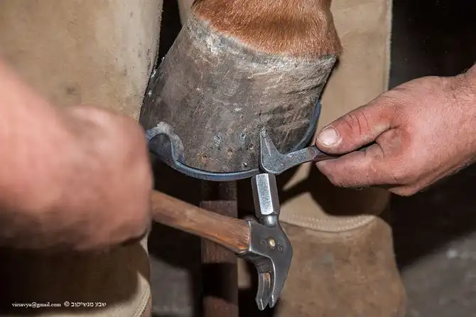 Гвозди прибиваются так: первый возле зацепа (передняя часть копыта), второй с другой стороны, потом снова с первой, потом снова со второй.
