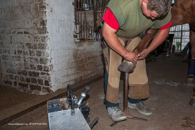 Для патрульных полицейских лошадей подковы нужны с шипами. Кузнец делает в подкове отверстия для шипов.