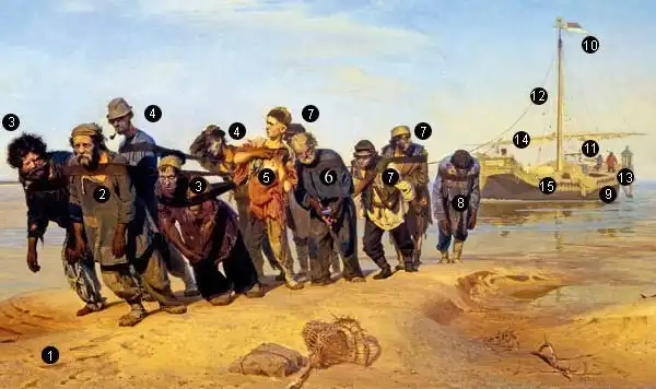 Подшишельные — ближайшие помощники шишки, чалившиеся справа и слева от него. По левую руку от Канина идет Илька-моряк — артельный староста, закупавший провиант и выдававший бурлакам их жалованье. Во времена Репина оно было небольшое — 30 копеек в день. Столько, например, стоило пересечь на извозчике всю Москву, проехав со Знаменки в Лефортово. За спинами подшишельных чалились нуждавшиеся в особом контроле.