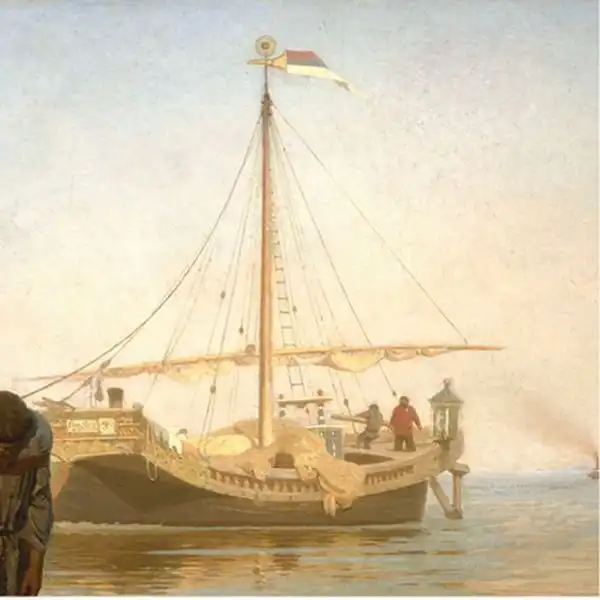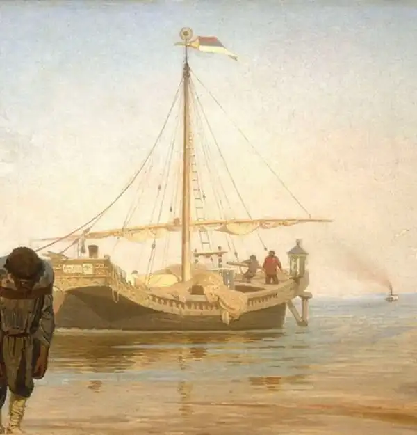 Вид барки. На таких возили вверх по Волге эльтонскую соль, каспийскую рыбу и тюлений жир, уральское железо и персидские товары (хлопок, шелк, рис, сухофрукты). Артель набиралась по весу груженого судна из расчета примерно 250 пудов на человека. Груз, который тянут вверх по реке 11 бурлаков, весит не менее 40 тонн.