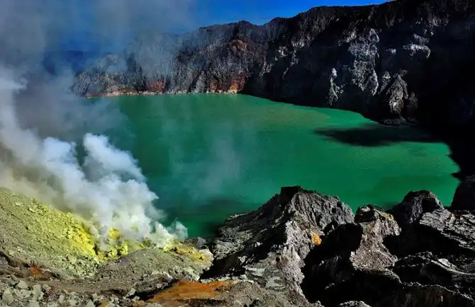 В восточной части индонезийского острова Ява есть один из самых красивых уголков на нашей планете. На высоте 2799 метров над уровнем моря возвышаются несколько вулканов с большим количеством кратеров. Самым восхитительным из них является Кавах Иджен с красивейшим бирюзовым озером около 1 километра диаметром и глубиной до 200 метров. Но пусть вас не прельщает эта красота.