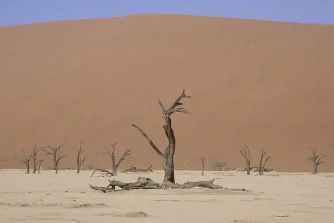 Пейзажи пустыни Намиб — высохшие акации на фоне оранжево-красных дюн — это одно из самых символичных мест на Земле. Dead Vlei находится в Национальном парке Sossussvlei в Намибии. Это часть огромной пустыни Намиб, которая дала свое название стране