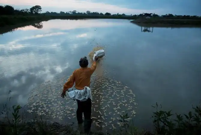 Прикармливают рыбу два раза в день — на рассвете и вечером. Корм производится тут же, на мини-фабрике.