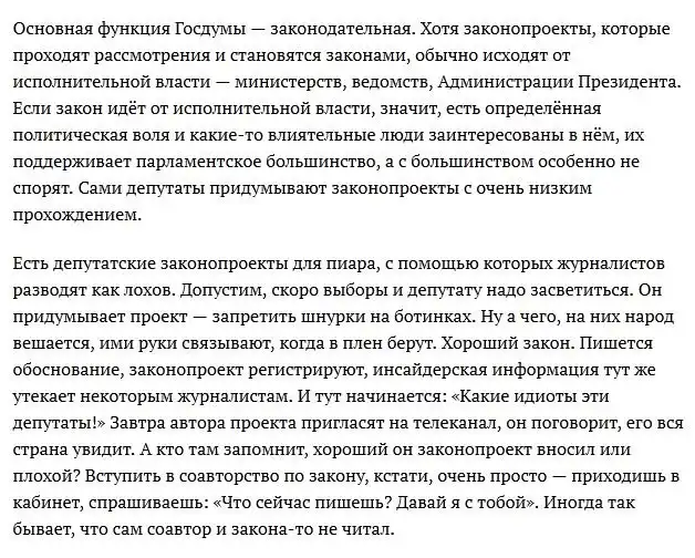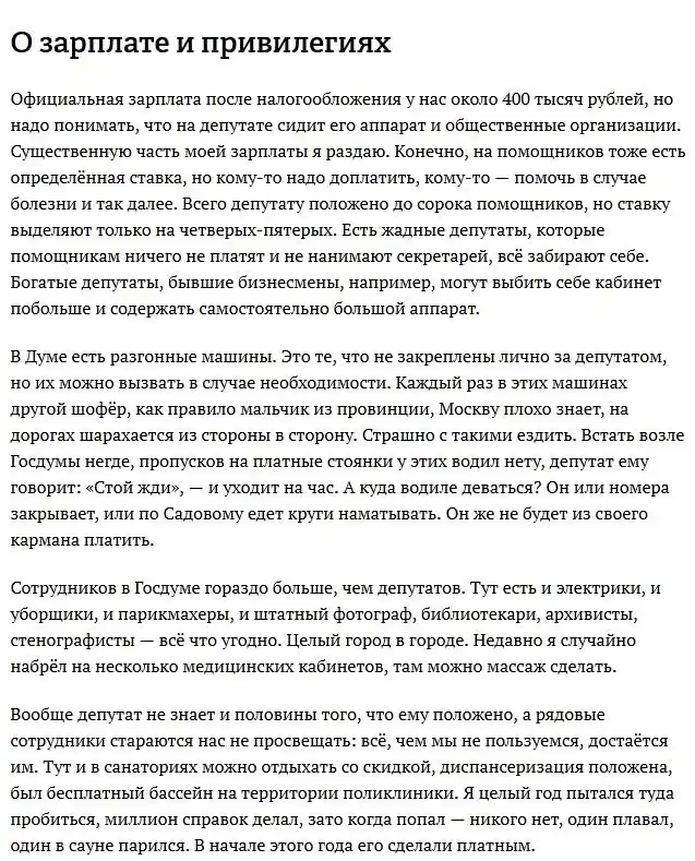 Один депутат Государственной Думы России поделился тем, что так интересно любому обычному гражданину нашей страны. В частности он рассказал о тонкостях своей работы, взаимоотношениях с коллегами и о том, какую помощь парламентарии оказывают простым людям.