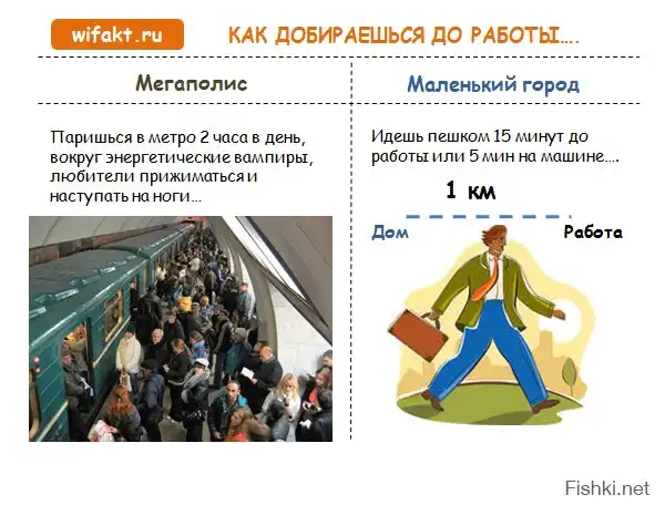 Все чаще жители мегаполисов, прежде всего столицы, подумывают о том чтобы переехать подальше от суеты в маленький город или деревню. Многие и переезжают. Кого-то останавливают трудности и остается мечтать, ну что ж, можно и мечтать, этого-то никто не сможет отнять. Просто должно быть у всех объективное понимание, что бытие определяет сознание: если живешь в огромном городе ты живешь по его законам - большие расстояния, гипермаркеты, хроническая усталость, метро и прочее, если живешь в маленьком городе жизнь более медленная, менее нервная, больше надо уметь руками делать, но и меньше денег понятно будет. Ну понятно везде есть минусы и плюсы, главное не бояться себе признаться что что-то не устраивает и уметь изменить свою жизнь в лучшую сторону!
