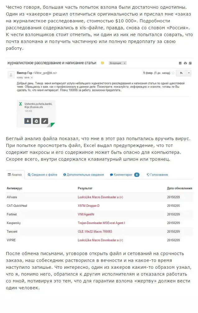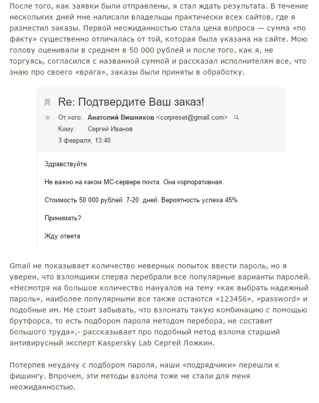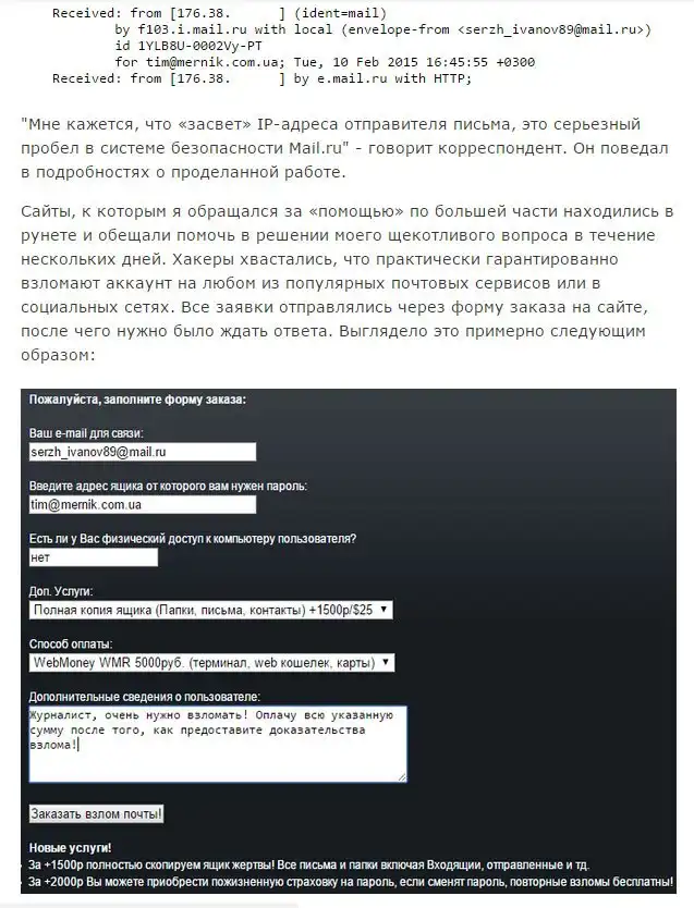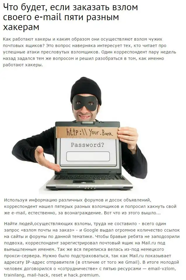 Эксперимент с услугой взлома почтовых ящиков, заказанной у пяти разных хакеров