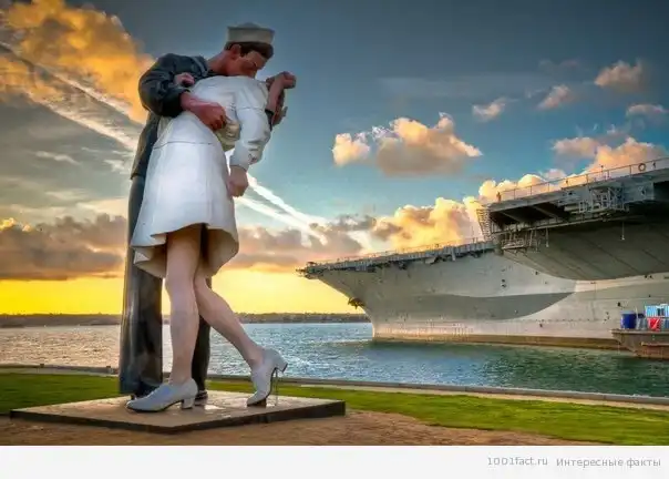 Статуя влюбленной парочки в Сан-Диего воспроизводит послевоенное фото, на котором встреча и поцелуй счастливых влюбленных – матроса и медсестры.