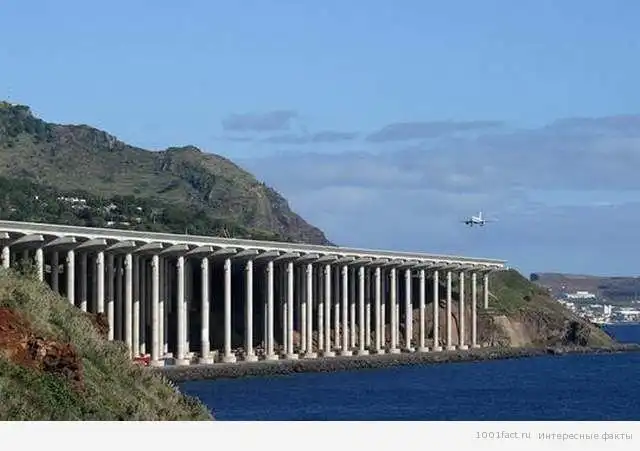 Международный аэропорт Мадейра, Санта-Круш (Португалия). Здесь с длиной ВПП все в порядке. Но каким образом эта длина достигнута?! Значительная ее часть покоится на 180 железобетонных столбах диаметром 3 метра каждый и высотой до 50 метров над уровнем моря! К тому же, чтобы приземлиться здесь, надо сначала направить самолет на горы, и буквально в самый последний момент крутым виражом выйти на посадочную прямую.