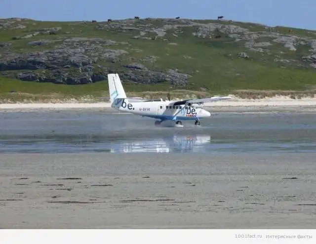 Аэропорт Барра, Внешние Гебриды (Шотландия). Аэропорт-призрак. Кроме шуток. Его три ВПП – песчаные (и на них могут садиться только самолеты типа «Твин Оттер»). И когда на море отлив – аэропорт есть. А когда прилив, и полосы заливает водой, — аэропорта нет. В тех же случаях, когда отлив есть, а рейсов нет, — аэропорта тоже нет. Тогда это просто пляж…
