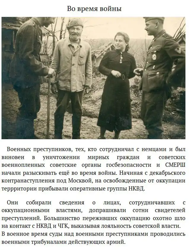 После окончания Великой Отечественной войны в Советском Союзе активно начали искать и наказывать людей, оказывавших содействие немцам. Несмотря на то, что найти всех предателей не удалось, немало людей получили заслуженное наказание за свои преступления.