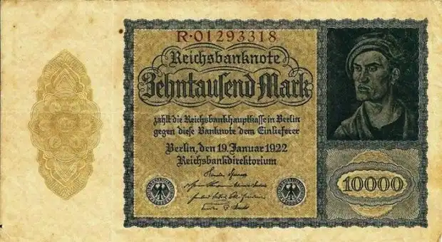 После того как Германия подписала Версальский мирный договор по окончанию Первой мировой войны в 1919 году, военные репарации фактически уничтожили экономику. Из-за этого Германия просто печатала деньги, чтобы осуществить свои платежи, приведя свою экономику в условия гиперинфляции. К 1922 году Рейхсбанк был вынужден издать купюру в 10 000 марок. Было решено, что на ней будет размещена картина знаменитого немецкого мастера Альбрехта Дюрерса под названием «Портрет молодого человека». Неизвестный гравер, однако, дорисовал молодому человеку капюшон вампира, который символизирует Францию, сосущую кровь у Германии. Его не просто рассмотреть, нужно наклонить голову вправо.