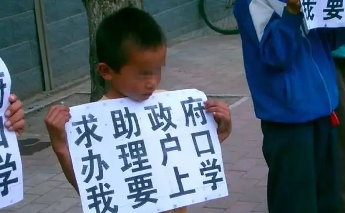 На фото - ребенок-黑户(черное население). Из требований на табличке: