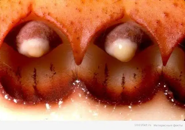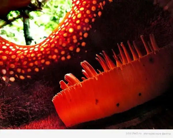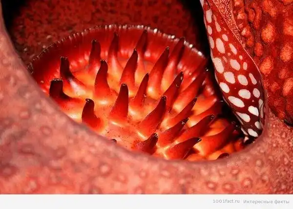 У цветка всего 5 массивных лепестков, а в центре располагается диск с пыльцой, покрытый шипоподобными выростами. Как и многие цветы, Раффлезия опыляется насекомыми. Только вот на период цветения вокруг цветка витает запах разлагающегося мяса, а само растение имеет ярко-красную расцветку с белыми наростами на лепестках. Поэтому вместо пчелок, на Раффлезию слетаются мухи.