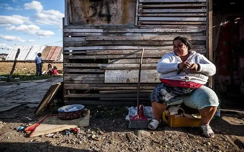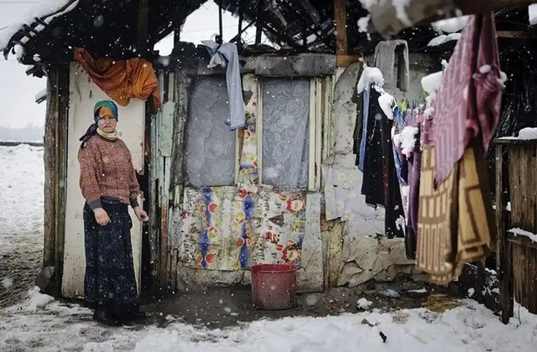 На фото: беременная женщина сидит во дворе своей хижины в трущобах в Румынии.