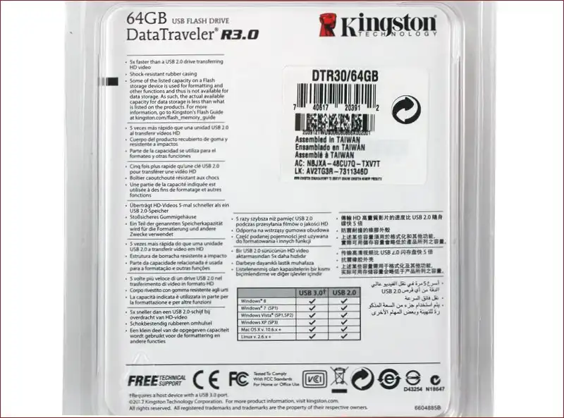 Наклейка с штрих-кодом содержит только несколько цифр и простой штрих-код, на оригинальном Kingston указывается два штрих-кода, номер партии изделия, информация о месте производства флешки, 12-значный штрихкод, парт-номер модели (прим. DTR30/64GB)…