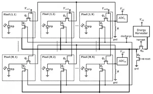 Дизайн простой: каждый фотодиод в сенсоре попеременно работает в двух режимах: сначала записывает количество фотонов, а потом генерирует ток в фотоэлектрическом режиме. Ток стекает в ионистор (суперконденсатор), который питает электронную схему.
