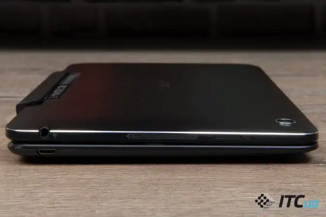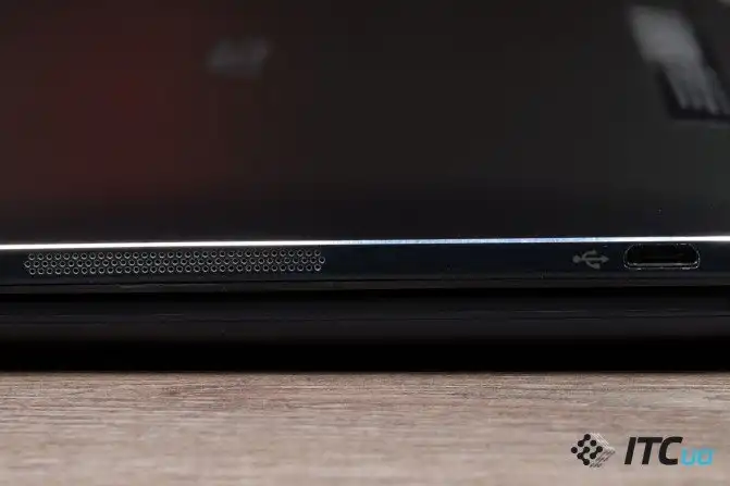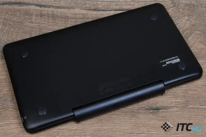 Нижняя часть и боковины док-станции ASUS Transformer Book T90 Chi изготовлены из того же темно-синего пластика, что и ее верхняя часть. Три из четырех боковых граней аксессуара свободны и только короткая левая боковина содержит единственный разъем micro-USB, который используется для заряда встроенного аккумулятора док-станции. На днище док-станции можно обнаружить четыре резиновые ножки, однако в рабочем положении клавиатура опирается на две передних ножки и две более скользкие пластиковые полоски на нижней части шарнира.