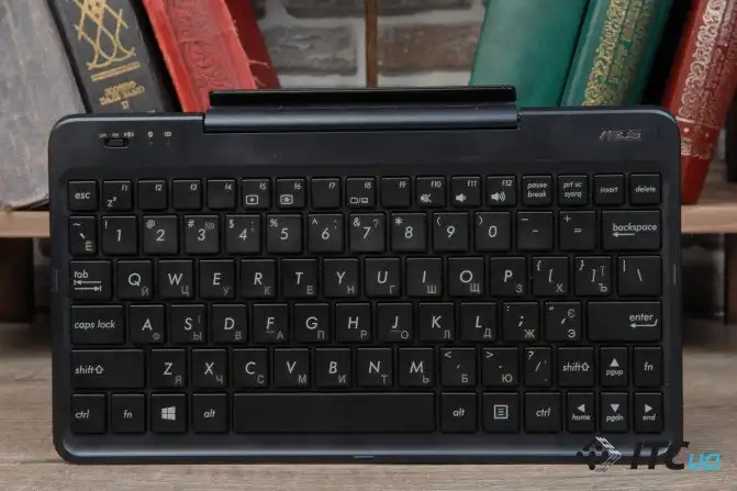 Кроме клавиатуры на верхней части док-станции ASUS Transformer Book T90 Chi можно найти миниатюрный логотип, индикаторы степени заряда встроенного аккумулятора и активности Bluetooth-модуля, а также небольшой трехпозиционный ползунок, который позволяет включить, выключить или перевести клавиатуру в режим “спаривания”.