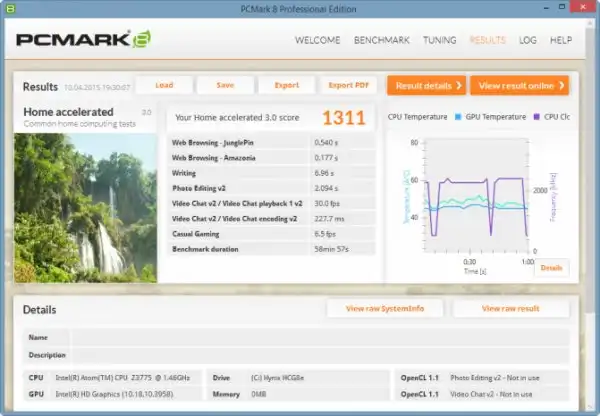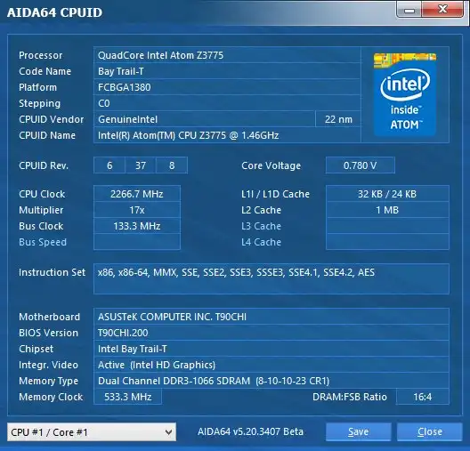 В качестве аппаратной платформы используется четырехъядерный процессор Intel Atom Z3775 (Bay Trail-T) с рабочей частотой 1,46 ГГц, которая в случае нагрузки может повышаться до отметки 2,39 ГГц. Процессор выполнен по 22 нм техпроцессу, уровень его тепловыделения в типичных условиях равен 2 Вт (SDP), а в самом тяжелом случае не превышает 4 Вт (Max TDP). Благодаря настолько небольшому тепловыделению процессор не нуждается в активной системе охлаждения.