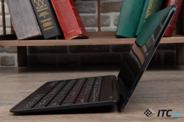 В сегменте Windows-планшетов чаще всего встречаются крупные устройства с диагональю от 10-ти дюймов и выше или же компактные 8-дюймовые модели. Однако разработчики ASUS Transformer Book T90 Chi решили использовать не самый привычный 8,9-дюймовый формфактор, который все еще остается достаточно мобильным, но при этом гораздо удобнее в работе, чем 8-дюймовые планшеты. Для справки, размеры планшетной части составляют 241×137×7,5 мм, а вес – 400 грамм.