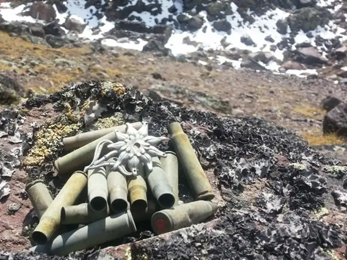 В 2012-м году на перевале "Донгуз - Орун" на высоте 2800 метров нашли пять пушек немецкого образца калибра 76 миллиметров. Здесь же сохранились и восемь снарядов к орудиям, четыре гранаты, три мины, 500 штук патронов.
