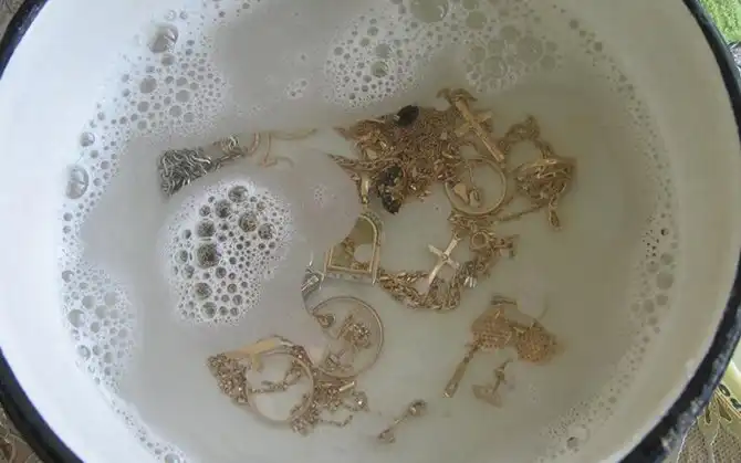 Часть соды и часть воды в сумме дадут кашеобразную массу, которой можно чистить ваши кольца, цепочки и кулоны посредством зубной щетки. Только осторожнее, не царапая металл. Закончив, смойте остатки и протрите тканью.