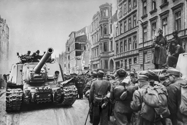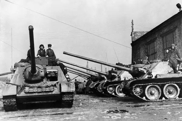 Самоходная артиллерийская установка Су-76 на улице Вены, 1945 год.