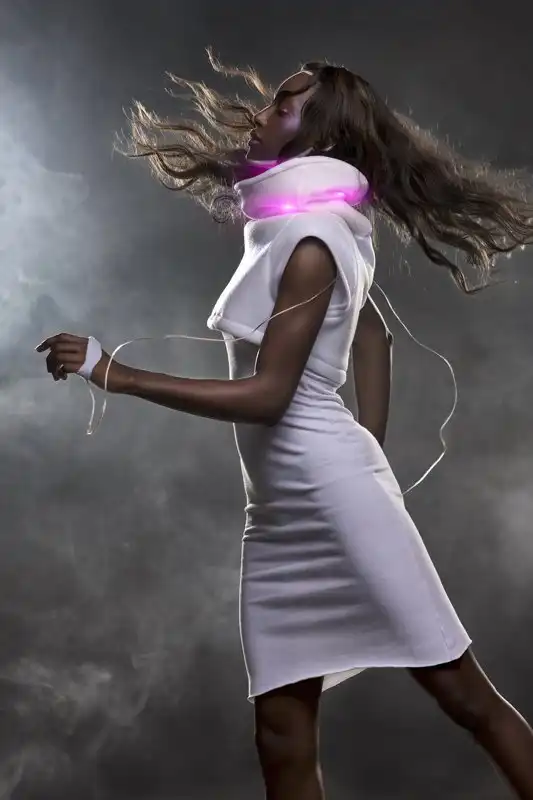 Этот короткий свитер иллюстрирует эмоции владелицы с помощью цветных светодиодов. Правда, считывание реализовано не слишком удобно: на ладони надеваются две ленты с гальваническими датчиками. Цвет меняется согласно заложенному в электронику алгоритму. На сайте висит информация об открытом предзаказе, но трудно сказать, насколько это актуально.