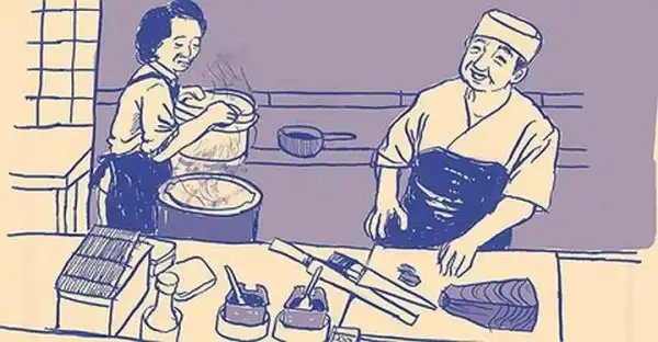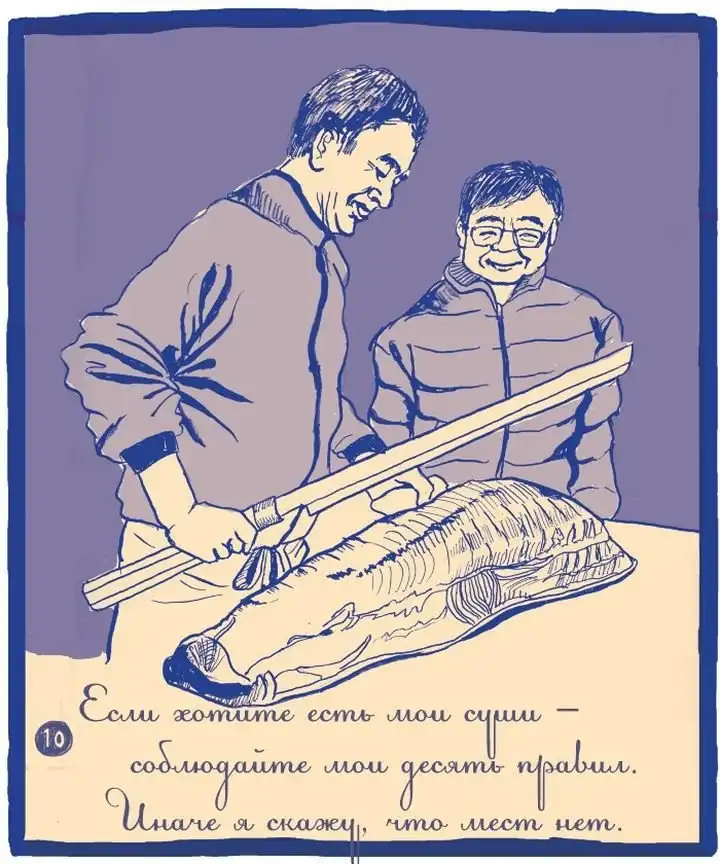Только я собрался с духом, чтобы расспросить господина Ядзима, как его супруга госпожа Йосико закричала с кухни: «Он странный!». Господин Ядзима кивнул: «Я говорю посетителям, что им делать». Но через несколько порций суши он подобрел и рассказал, как стал шеф-поваром, как вместе с женой управляет суши-баром уже 34 года и что такое «десять заповедей едока суши».