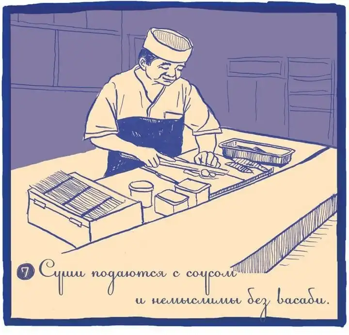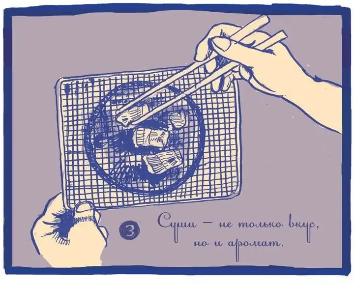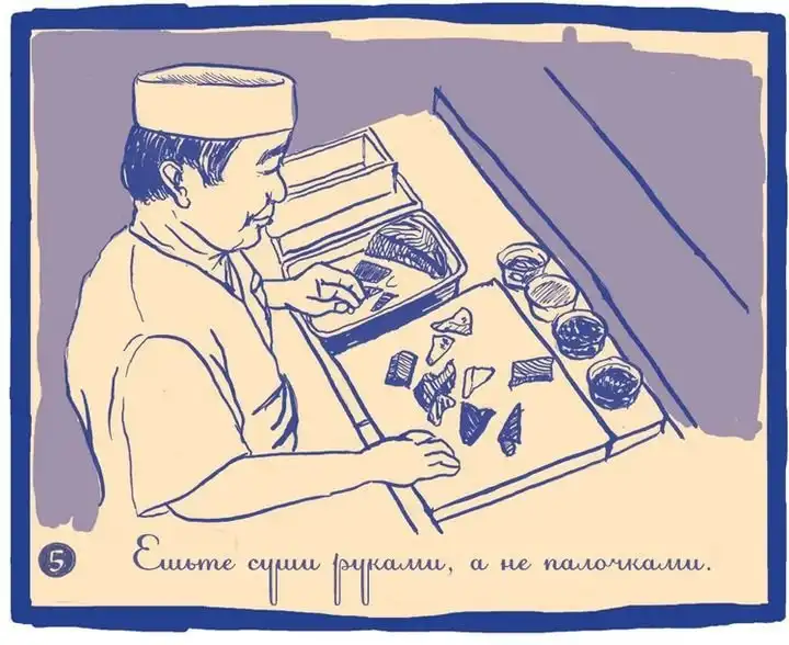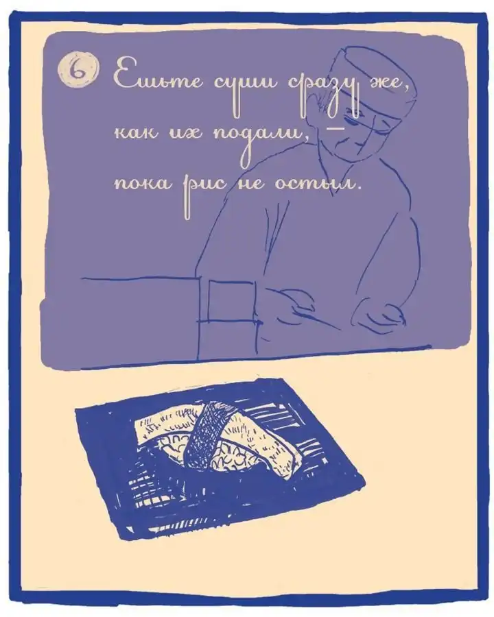 «Суши — хрупкое блюдо. Если есть их палочками, рис может раскрошиться, и суши потеряют форму. Надо есть их руками — тогда вы почувствуете блюдо. К тому же так быстрее».