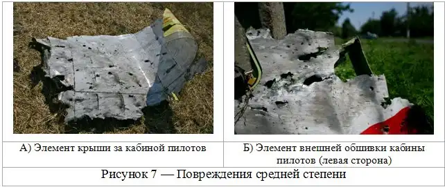 Наибольший интерес представляет анализ повреждений крыши кабины пилотов. На рисунке 6 представлен элемент крыши за кабиной пилотов, который в Предварительном отчете Международной комиссии являлся примером множественных осколочных повреждений конструкции планера самолета.