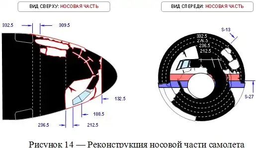 Анализ реконструкции носовой части самолета позволяет определить углы пересечения ракетой курса самолета в точке подрыва боевой части.