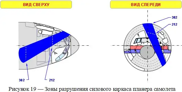 Области разрушения силового каркаса планера самолета на рисунке отображены синим цветом. Именно разрушение силового набора верхней части фюзеляжа — шпангоутов (поперечных силовых элементов) от № 212 до № 382 и стрингеров (продольных силовых элементов) привело к разрушению самолета Boeing-777 в воздухе. При таких разрушениях одновременно произошло отделение передней части фюзеляжа с кабиной экипажа, что подтверждается кроками места авиационного происшествия.