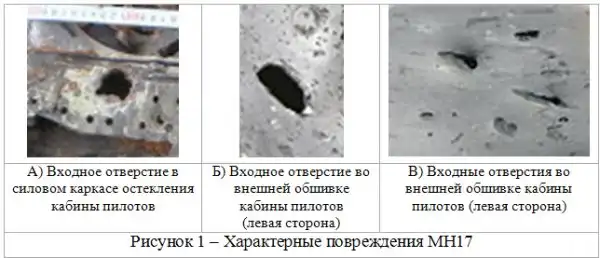 Исследование фотоматериалов из сети Internet, связанных с авиакатастрофой Boeing-777 МН17, позволило идентифицировать повреждения внешней обшивки корпуса и силового набора самолета, характерные для трех фракций поражающих элементов. Наиболее характерные повреждения представлены на рисунке 1