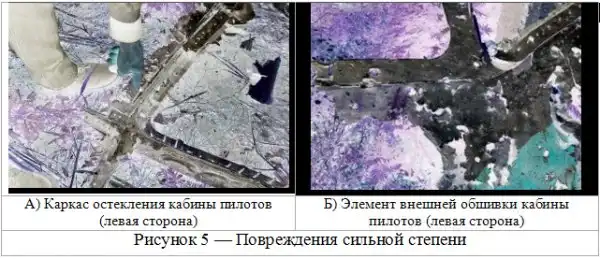 Наибольшие повреждения сильной степени наблюдаются в носовой части самолета в районе кабины пилотов (левая сторона), крыши кабины пилотов и на воздухозаборнике левого двигателя. Примеры повреждений сильной степени приведены на рисунке 5.