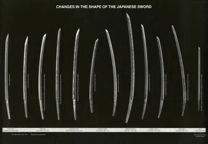 Ещё один миф связан с тем, что облик японских мечей оставался неизменным с течением времени. Действительно, японские мечи не подверглись трансформации так радикально, как европейские мечи, однако всё же можно проследить множество их тонких изменений на протяжении веков. На этой картинке устаревшие формы мечей представлены справа, а соверменные – слева.