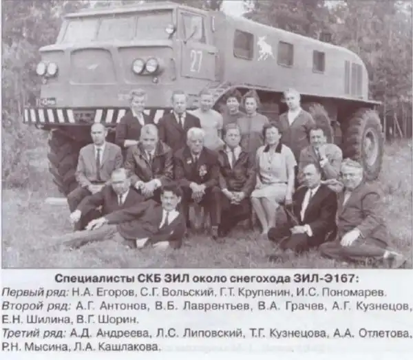 Группа проекта.В конце 1950-х завод им. Лихачёва получил новый заказ - колесный снегоход с грузоподъемностью три тонны для перевозки людей. Срок реализации проекта был установлен 1 января 1963 года. Разработчики решили использовать в новом автомобиле уже проверенные временем разработки. Так, для создания ЗиЛ-E167 были использованы укреплённые шасси ЗиС-E134, выпущенного в 1955 году.