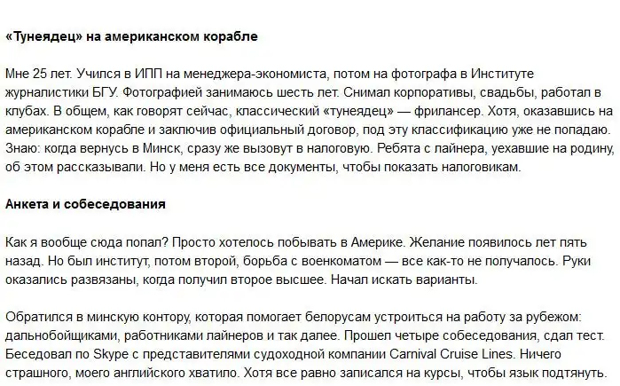 Далее вас ждет рассказ простого белорусского парня по имени Илья, который перебрался из Минска в США. Сейчас молодой человек работает фотографом на круизном лайнере, путешествует по всему миру, но при этом планирует когда-нибудь вернуться на родину.
