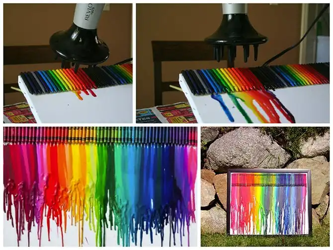 Чтобы нарисовать такой шедевр понадобятся восковые мелки, мольберт и фен. Закрепите мелки на мольберте и подогрейте их феном. Получается эффект радуги!