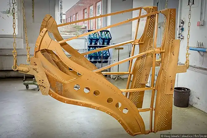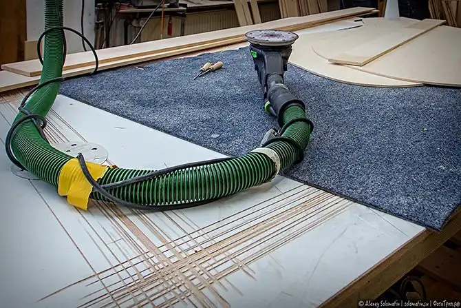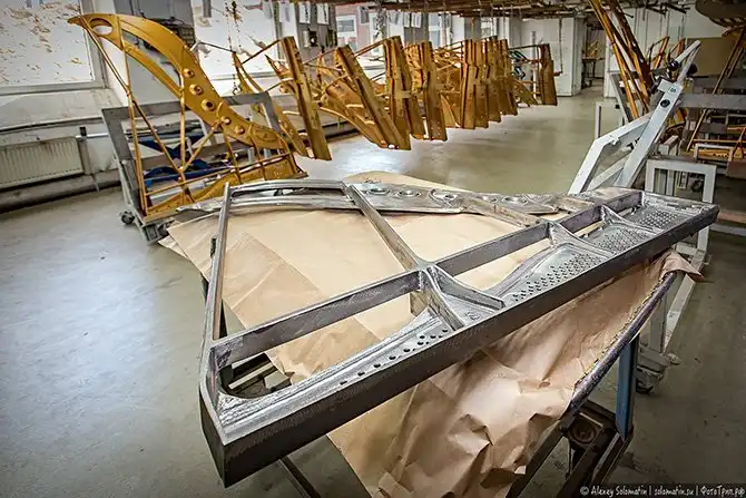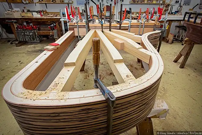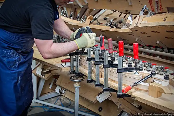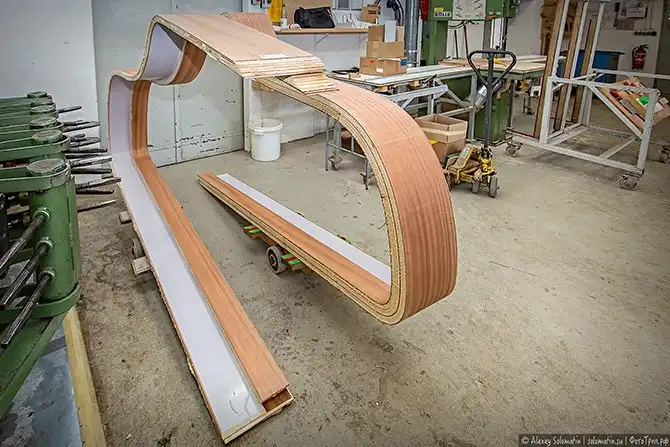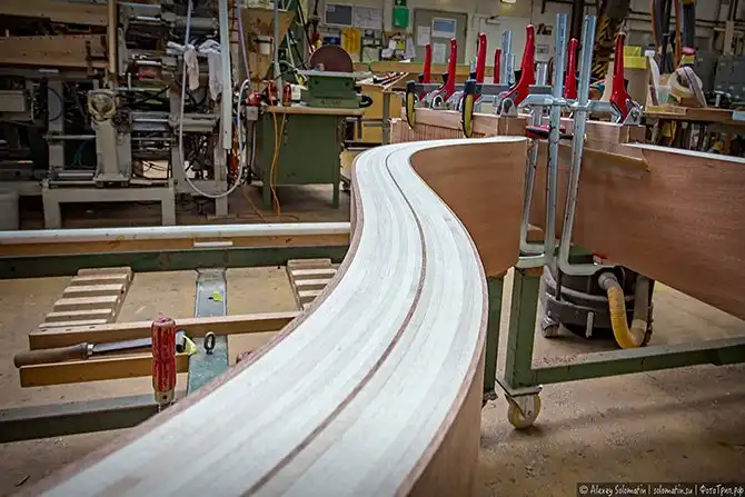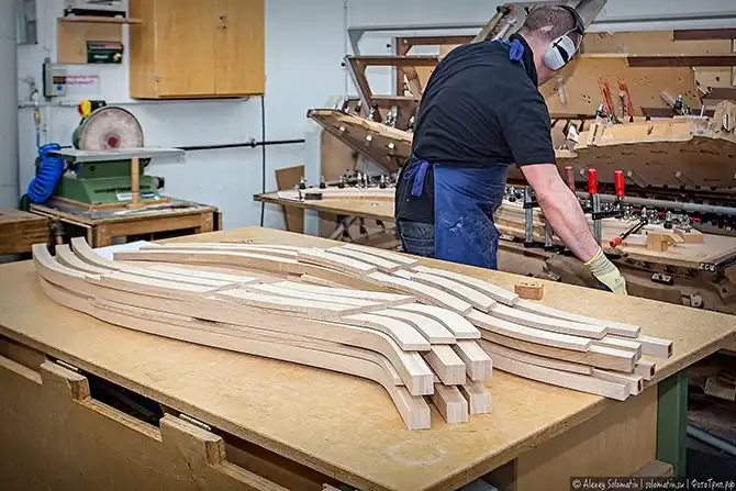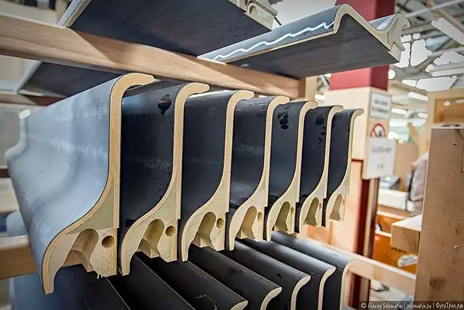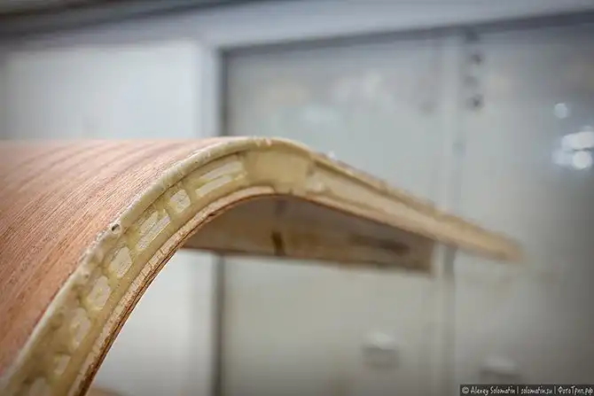 Боковой остов состоит из 17 листов клинового шпона, склеенные между собой и с помощью специального пресса изогнутые в нужную форму: