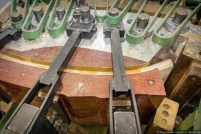 Обратите внимание не этот ровненький срез. Это как раз тот самый бутерброд, который загоняли в пресс на первом этапе. Шпон подобран с поразительной точностью по толщине, все очень грамотно и отточено годами. В итоге, это все скажется на качестве звука и долговечности инструмента: