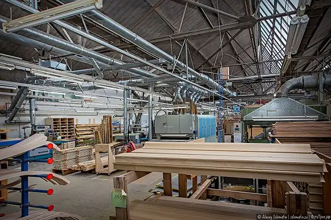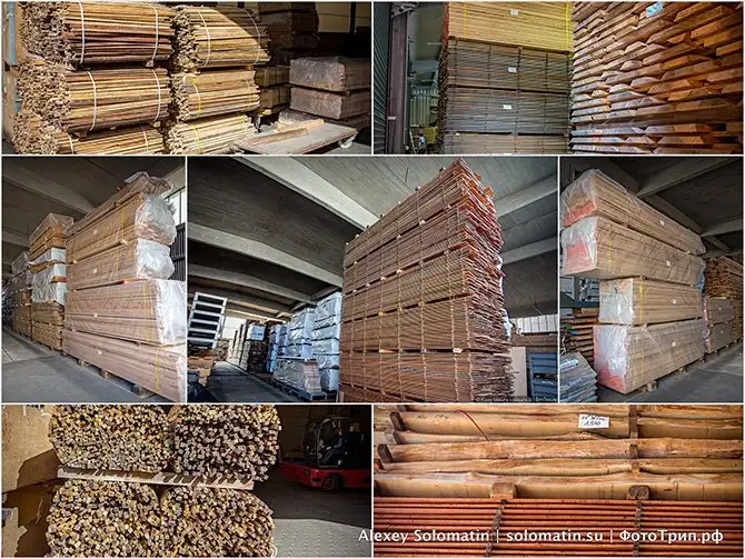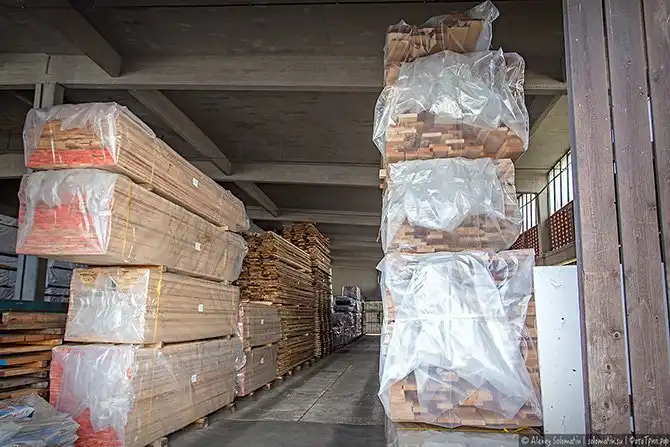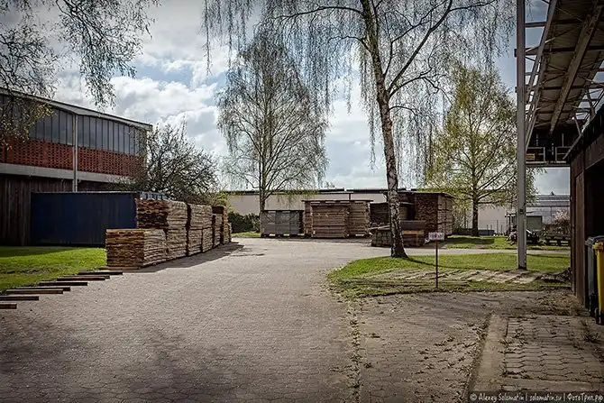 Большую часть уличной территории занимаю склады с древесиной, основного материала, из которого и рождается рояль: