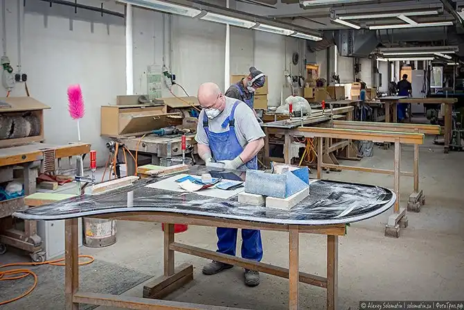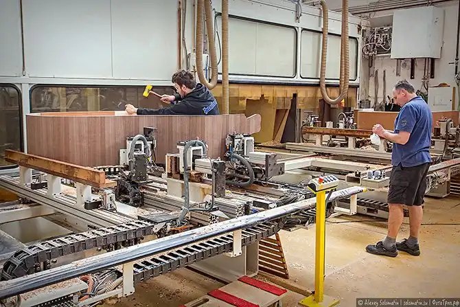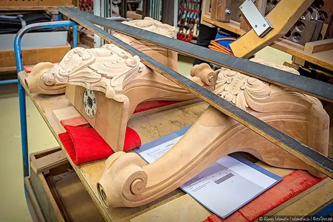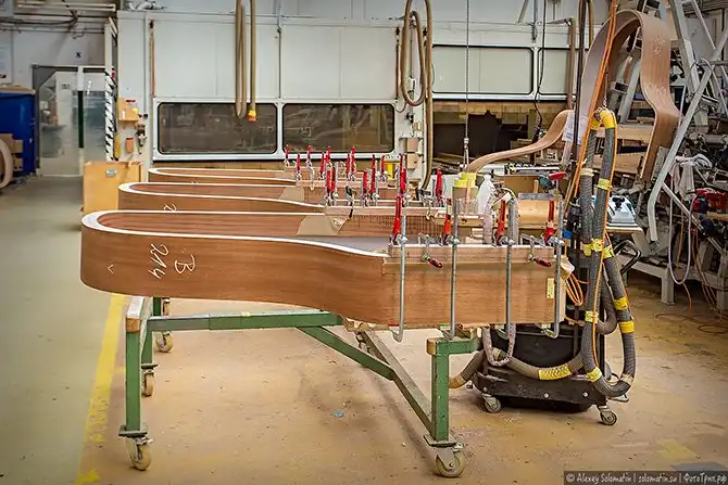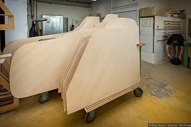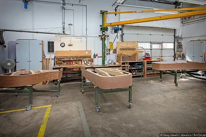 Ну а мы перемещаемся следующий цех. Здесь склеивают другие деревянные элементы рояля:
